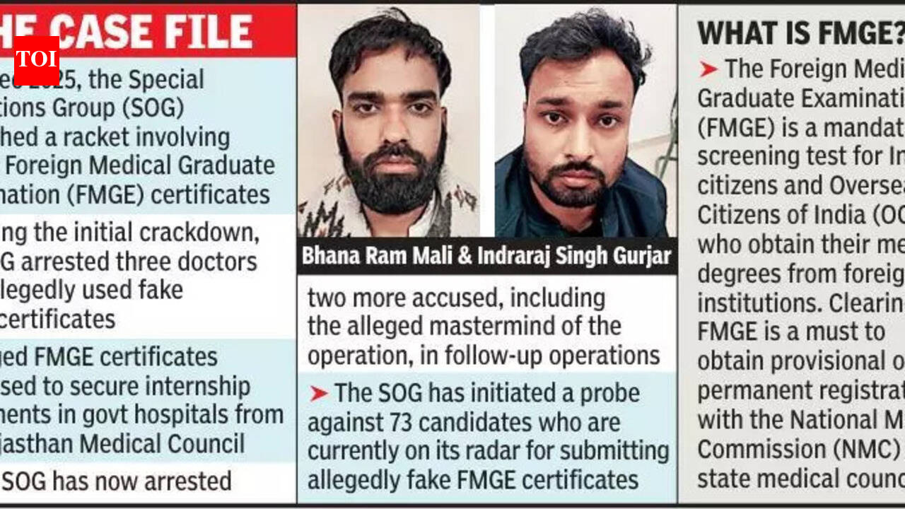 Jaipur: Rajasthan Police’s Particular Operations Group (SOG) has arrested two graduates who obtained their medical levels from overseas earlier than allegedly procuring and submitting solid Overseas Medical Graduate Examination (FMGE) certificates to acquire internships from the Rajasthan Medical Council (RMC).The FMGE is obligatory for residents with a overseas medical diploma who want to observe in India.The principle accused within the case, Bhana Ram Mali alias Bhanu (30), was detained at New Delhi airport on Feb 2 and formally arrested the next day. The MBBS graduate from Kazakhstan is taken into account the mastermind behind the scheme, not solely securing a solid FMGE certificates to realize a medical internship for himself but in addition serving to others in related conditions purchase fraudulent certificates. In accordance with extra director basic (SOG) Vishal Bansal, Mali is a resident of Bar in Beawar district and was dwelling in Jyoti Nagar, Jaipur.Authorities revealed he had tried to evade seize by travelling via a number of nations, together with Thailand, Sri Lanka, Dubai, Kazakhstan and Nepal, earlier than being intercepted by the SOG at New Delhi airport based mostly on particular intelligence inputs about his actions.The second accused, arrested from Dausa Thursday, has been recognized as Indraraj Singh Gurjar (27). He too acquired his MBBS diploma from Kazakhstan earlier than acquiring a solid FMGE certificates dated Dec 2022 from Mali.SOG officers mentioned Gurjar used this solid certificates to finish an internship on the Rajiv Gandhi Medical School in Alwar, earlier than receiving a provisional registration. He’s additionally accused of supplying solid FMGE certificates to different candidates for financial acquire.Bansal mentioned the most recent arrests are usually not remoted, because the SOG had in Dec final yr arrested three different graduates with medical levels from overseas who had equally submitted solid FMGE certificates. “Mali had absconded following these arrests,” Bansal mentioned.The SOG registered a contemporary case within the matter Wednesday, and efforts are underway to confirm suspect FMGE certificates submitted by different candidates.“Our investigation has revealed an intensive community involving round 73 candidates who had earned their medical levels abroad however did not go the FMGE check. These people had subsequently produced solid FMGE certificates to use for internships underneath the RMC,” Bansal mentioned.