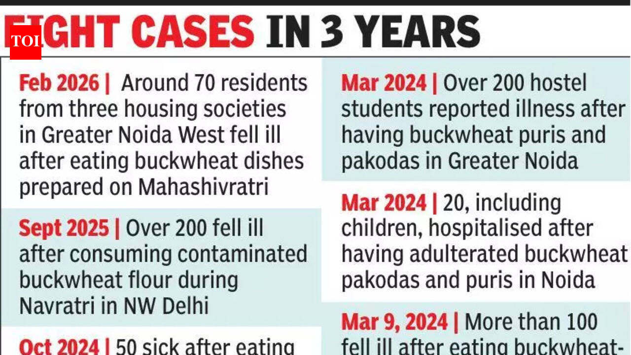 Noida: At least 70 people from three different societies in Greater Noida West—Supertech Ecovillage 3, Himalayan Pride and Royal Court Society— fell ill after consuming meals made of kuttu (buckwheat) flour while breaking fasts during the Mahashivratri festival on Sunday.The Bisrakh police registered an FIR under Section 275 (sale of noxious food or drink) of BNS and relevant sections of the Food Safety and Standards Act, 2006, on the complaint of the food safety officer. Police also sealed one shop in Royal Court Society and the warehouse which supplied the particular batch. Four people, including the warehouse owner, were detained. Families reported nausea and vomiting and reached their nearby hospitals on Sunday night, where some continue to be admitted. “My wife, our daughter and I started feeling dizzy around 10pm after eating dinner. We fasted for Mahashivratri and ate kuttu flour rotis for dinner. We earlier thought it was due to low blood pressure, but when we started vomiting, we rushed to the hospital,” said Ajay Sharma, a resident of Supertech Ecovillage 3, whose family is admitted at Max Hospital in Sector 128.Another resident of the same society, Madan Malik, a senior citizen, said, “My wife and I are admitted in the ICU at Kailash Hospital in Sector 71. We ate kuttu roti for dinner yesterday for the Mahashivratri fast.”According to the food department, the source of the buckwheat was traced to a single manufacturing unit in Chipyana Buzurg village in Greater Noida West. The manufacturer, HD Spices, had procured a supply licence from the Ghaziabad food department. People bought the particular batch through quick-delivery apps as well local grocery and ration stores.“Police teams inspected shops in Supertech Ecovillage 3 Society, Royal Court Society and Himalayan Pride Society from where cases were reported and collected samples of buckwheat flour from all identified outlets. During the inspection, irregularities were found at Prashant General Store in Royal Court Society, following which the shop was sealed. Further inquiry revealed that the affected residents had purchased the flour supplied by HD Spices with its warehouse located in Chipiyana Buzurg,” a police officer from Bisrakh police station said. “Based on this lead, the team conducted an inspection at the warehouse. Upon finding irregularities there as well, the warehouse was sealed. The food department is continuing to collect samples from other shops and further action will be taken as per law,” the officer stated. “The source of the buckwheat flour was traced on the basis of the statements of the patients. The same supplier was traced through both channels, delivery apps and shops. We took samples of the flour from the shops and warehouses, and from the manufacturer, for further investigation,” said Sarvesh Kumar, assistant commissioner of food, Noida.He added that the exact cause—bacterial contamination, fungal toxins or deliberate adulterants—will be determined following testing of the samples.Though officials said they received reports from two hospitals that around 40 people have been admitted due to food poisoning, TOI found that over 70 had been admitted in different hospitals in and around the Greater Noida West area.Komal, a resident of Himalayan Pride Society who, along with her parents, husband, and son, is admitted at Numed Hospital, said, “I bought the buckwheat flour from the local ration shop in our locality and made pooris. My family and I ate it for dinner and went to sleep, after which we started having stomach ache and then vomiting. I showed the packet of buckwheat flour to the doctors at the hospital.”An official from Numed Hospital told TOI that around 35 patients arrived with food poisoning symptoms around 11pm on Sunday. “Twelve of these patients were discharged after preliminary treatment, while others were admitted as they required further medical care. As of Monday, around 25 patients, including children and senior citizens, are admitted and under observation. Their conditions are stable.”Four people were admitted at Kailash Hospital, Sector 71, on Sunday night. According to the hospital spokesperson, three people complained of stomach ache and nausea and were discharged on Monday. “One patient is still admitted as she has other comorbidities. The patient is around 70 years old,” said the spokesperson. A spokesperson at Yatharth Hospital in Greater Noida West said 28 people, including 15 women, seven men, and six children arrived at the hospital with complaints of loose motions, headache, and diarrhoea on Sunday. “All patients were immediately admitted to the emergency department, and treatment was promptly initiated by a team of specialist doctors with the best available medical facilities,” the spokesperson said.Experts said that buckwheat flour is often stored for long periods because it is not used regularly. “When shopkeepers keep it on shelves for too long, its quality can deteriorate, leading to digestive problems and other health issues. It’s safer for consumers to buy buckwheat seeds and grind them fresh at home to avoid such risks,” Dr Ajay Rana, CMS, Noida District Hospital, told TOI.